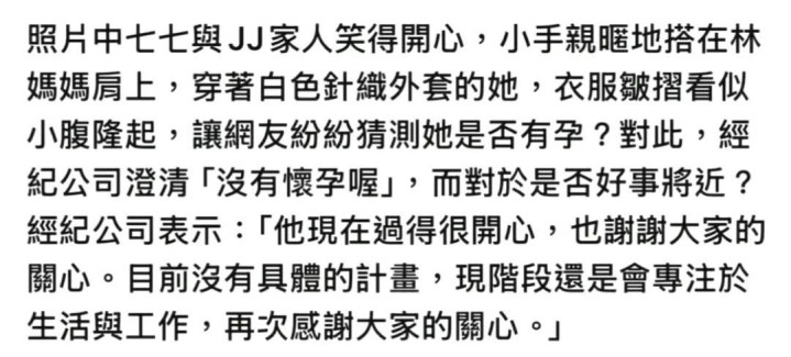 更有意思的是,合照里七七穿的宽松长裙还引发了“怀孕猜测”,不少网友放大照片分析“身形看着像有孕”。
