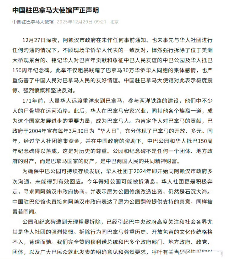 深夜推土机轰鸣盛盈优配,中式牌楼轰然倒塌,汉白玉狮子滚落在地——12月27日,巴拿马阿赖汉市政府趁夜色,把象征中巴友谊的华人纪念碑夷为平地,连句通知都没有 !这哪是拆公园,分明是在践踏30万华人的尊严,无视171年的血汗历史!